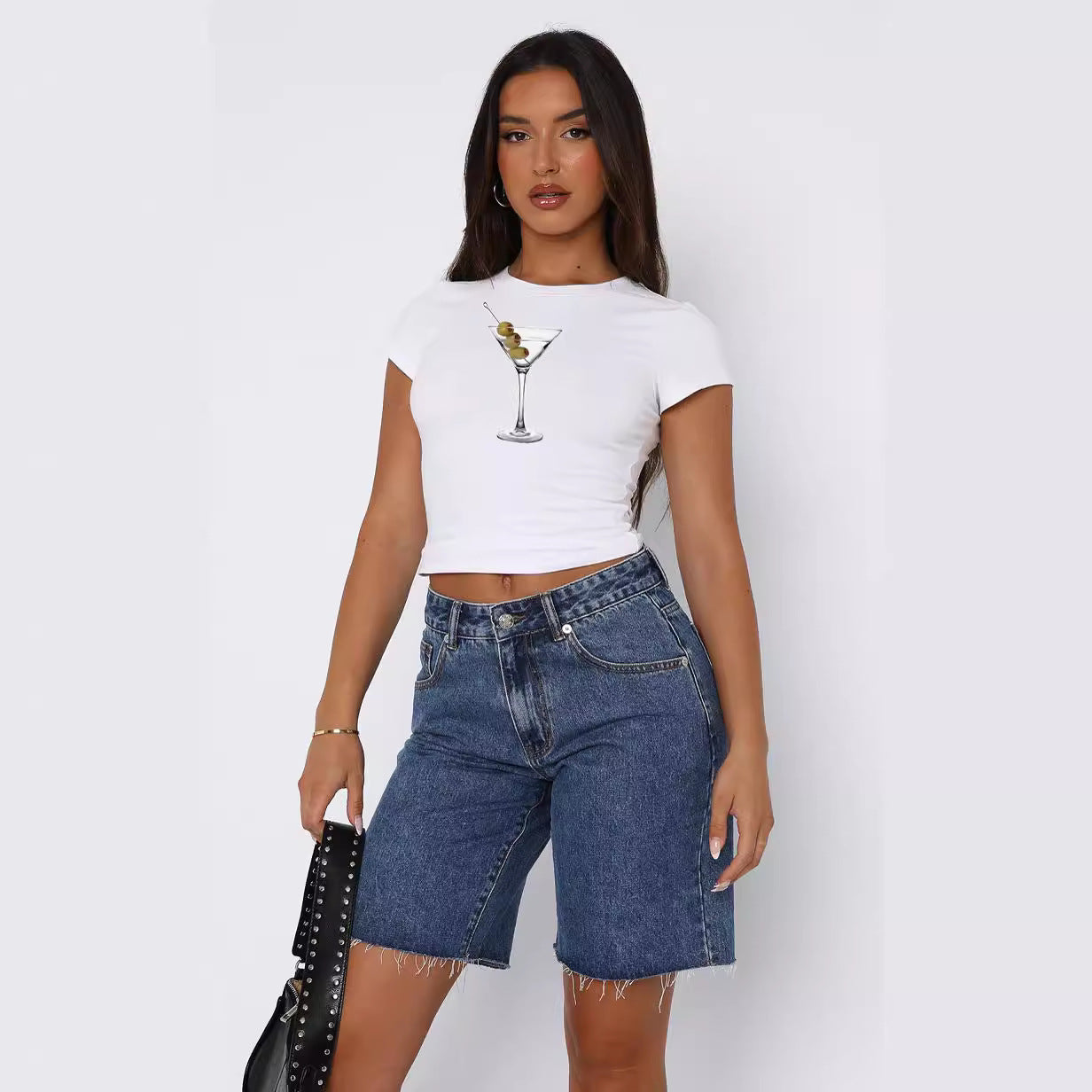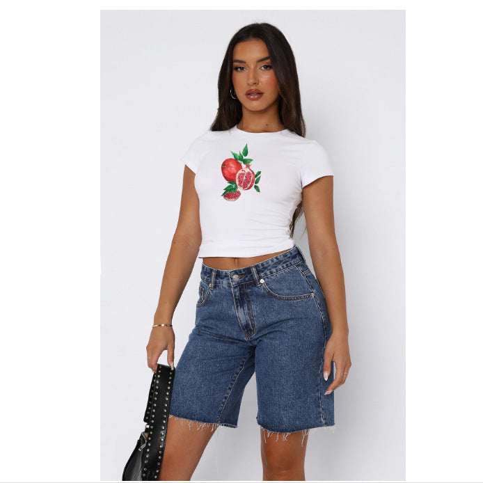 Round Neck Printed Short-sleeved Top Street Fashionable Slim-fit Short Navel All-match T-shirt For Women